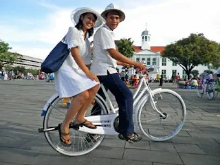SESEKALI saya pun ingin dipotret dengan nuansa kuno. Saat hari Minggu lalu saya ke kawasan kota tua bersama istri, saya lalu menyewa sepeda onthel dan bergaya layaknya seorang tuan Belanda. Kebetulan, istri saya sengaja memakai baju putih panjang sehingga penampilannya pun seperti Noni Belanda.